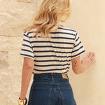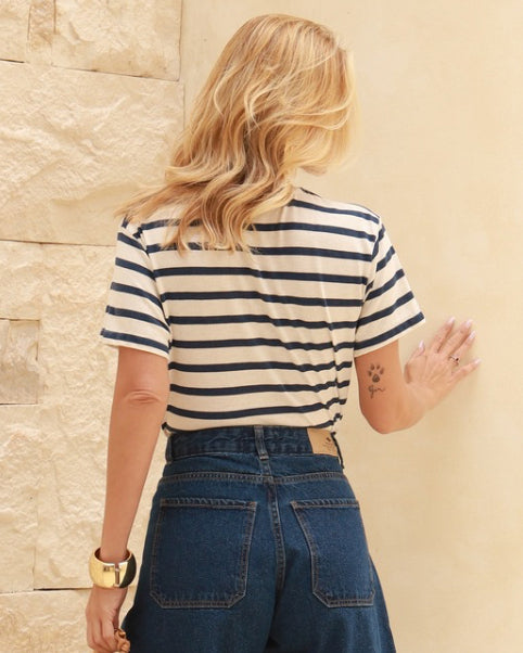 Descrição do Produto• Camiseta com gola em V• Tecido listrado com toque macio e confortável• Modelagem com ombro deslocado, que adiciona um caimento moderno