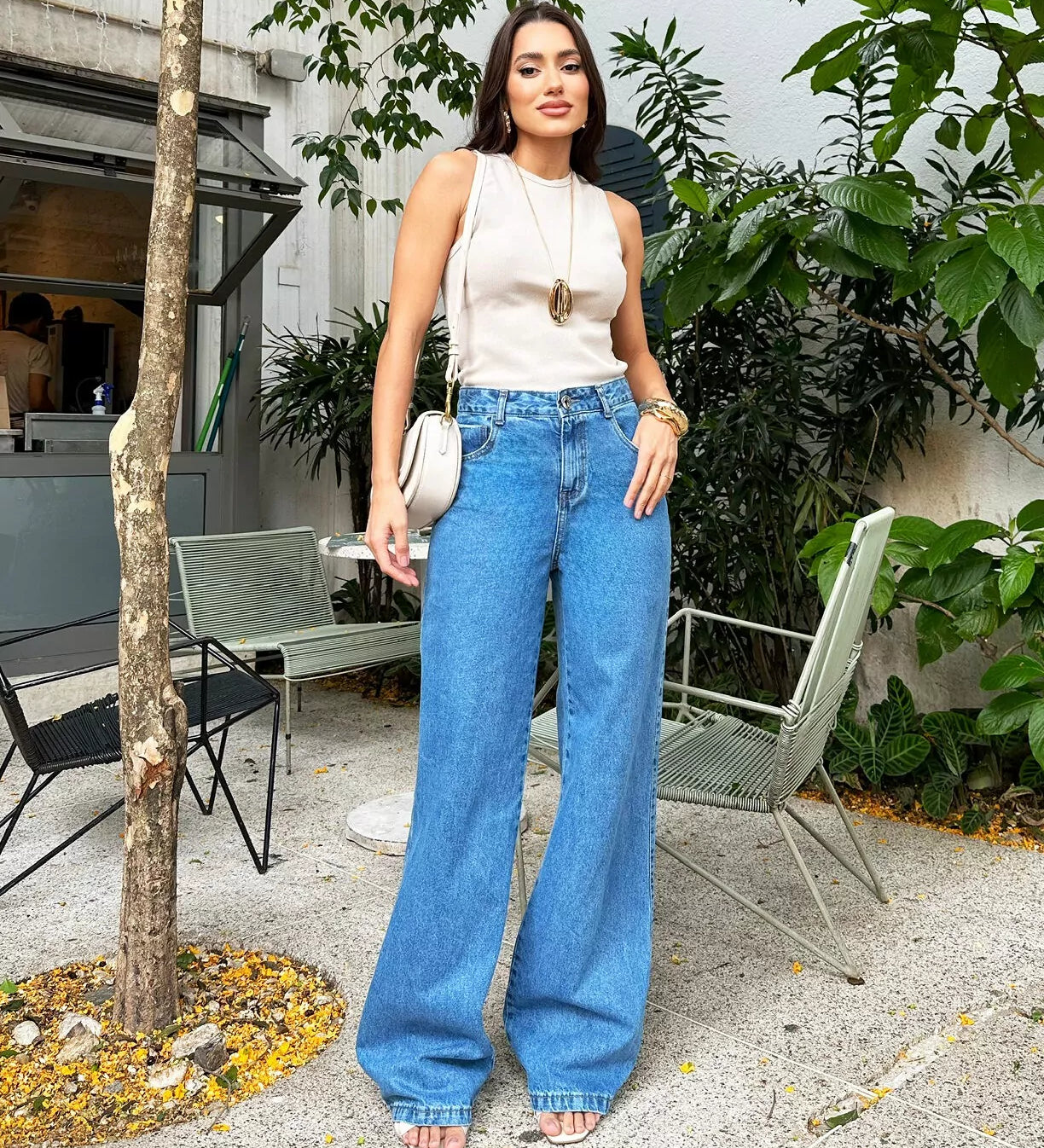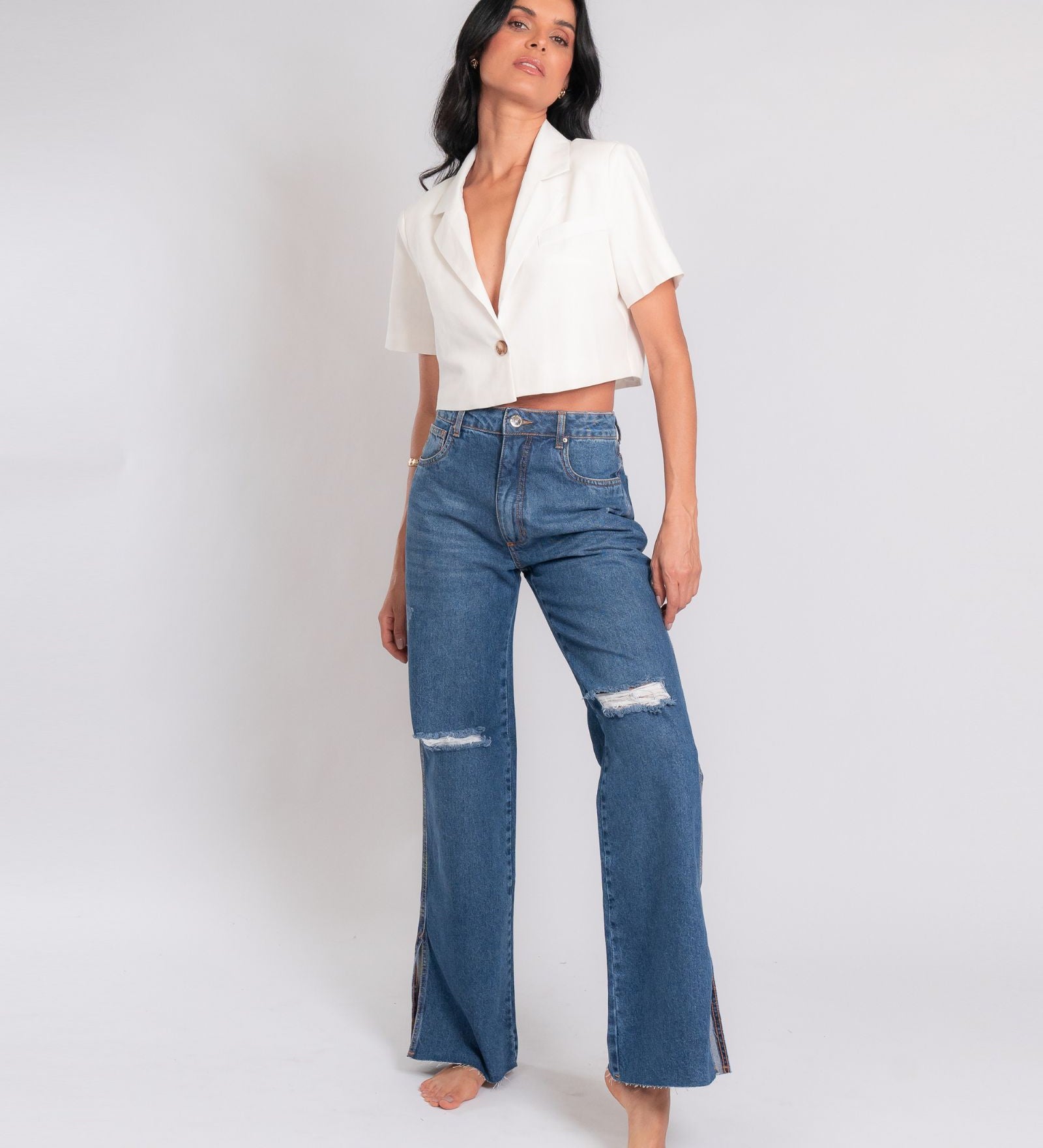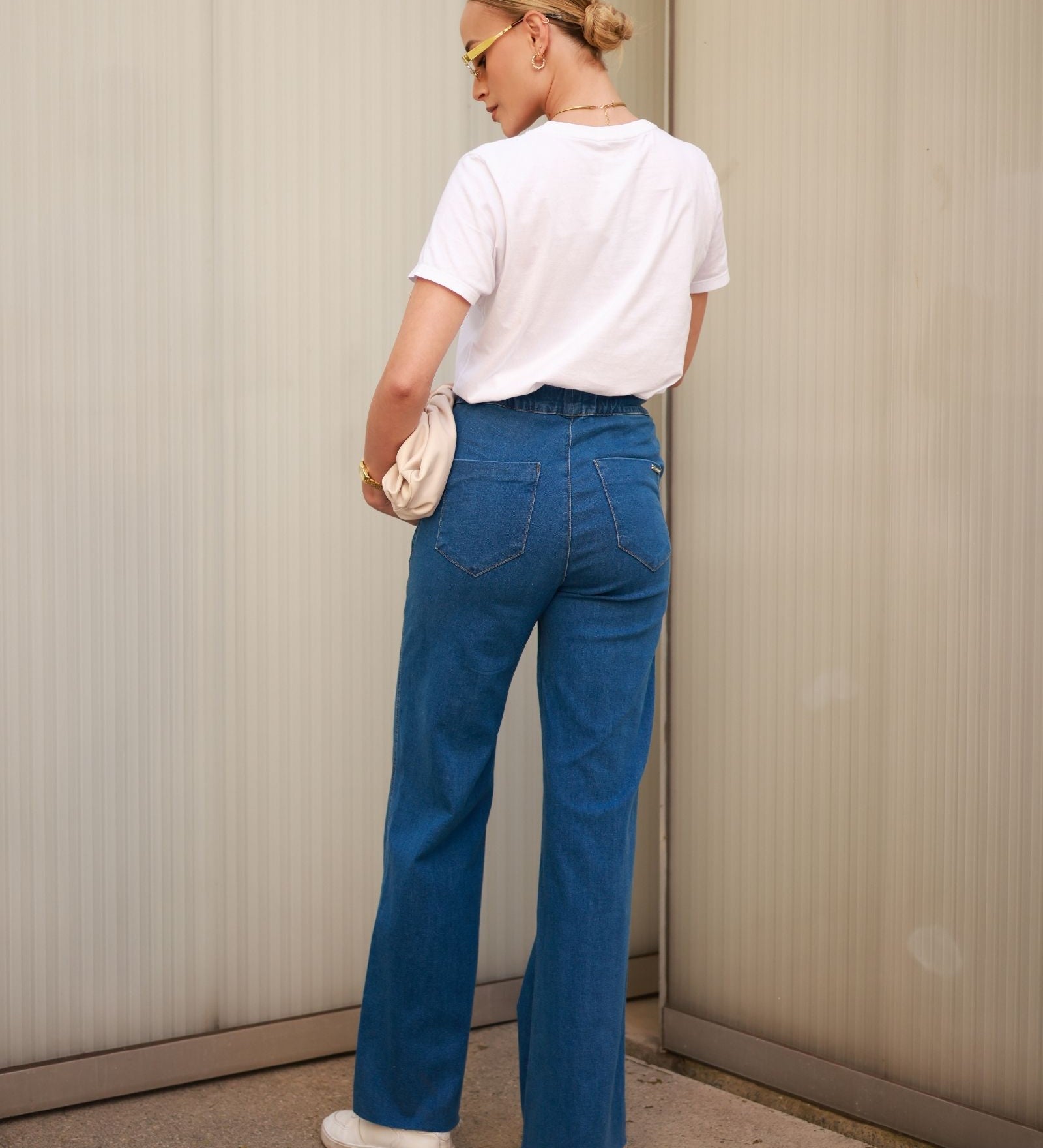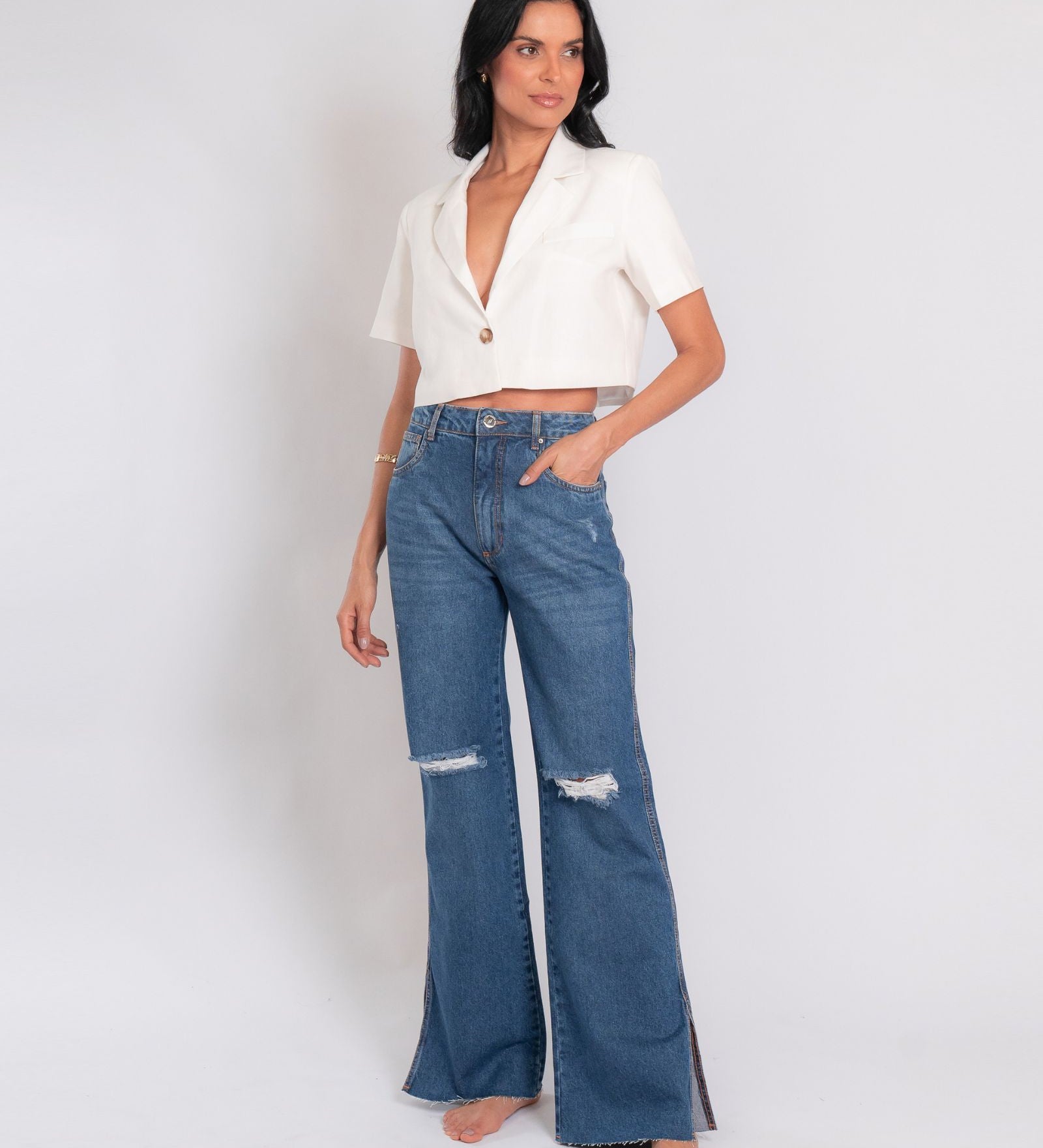 Calça Wide Leg sem Cós com Faixa em Jeans