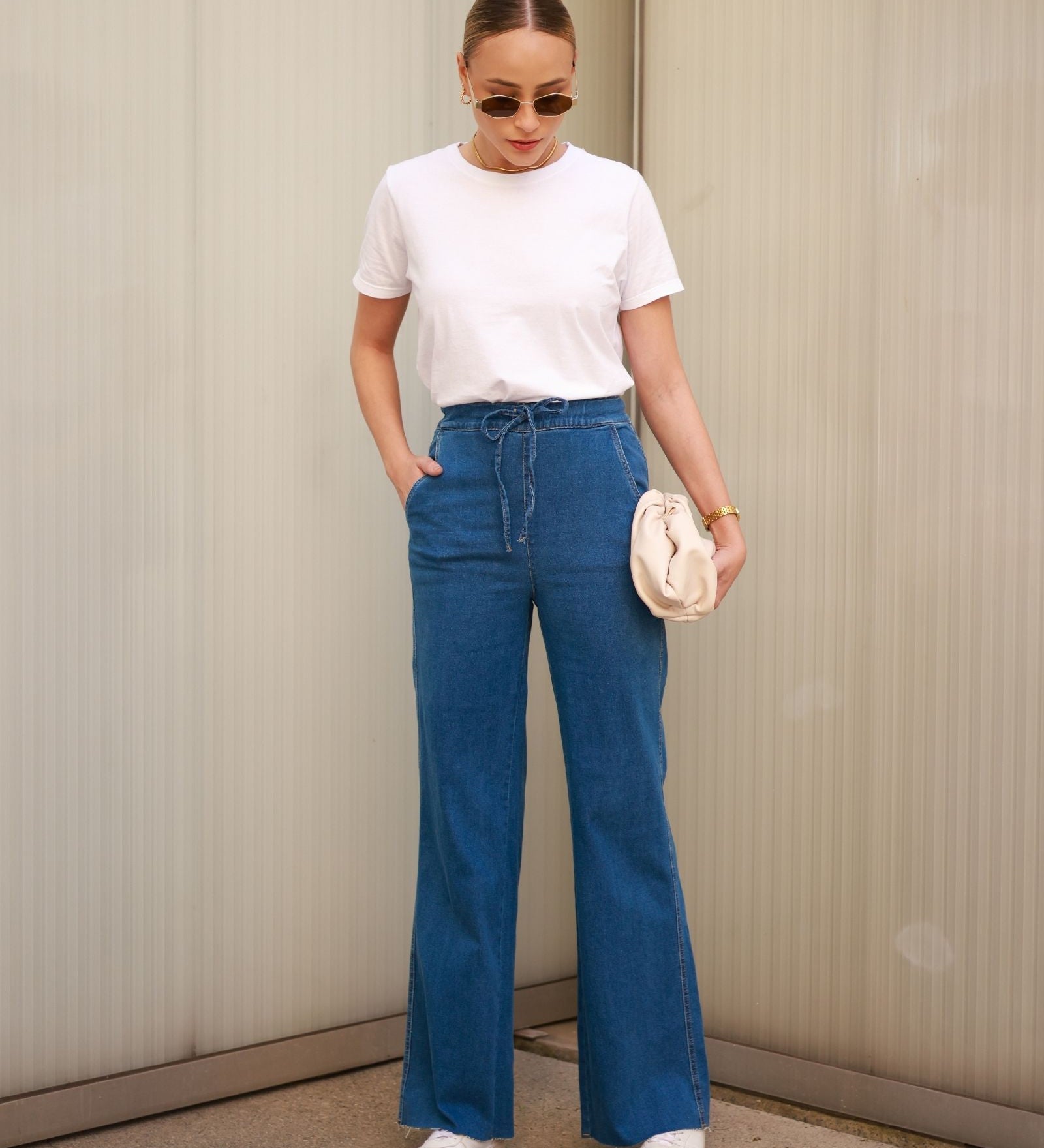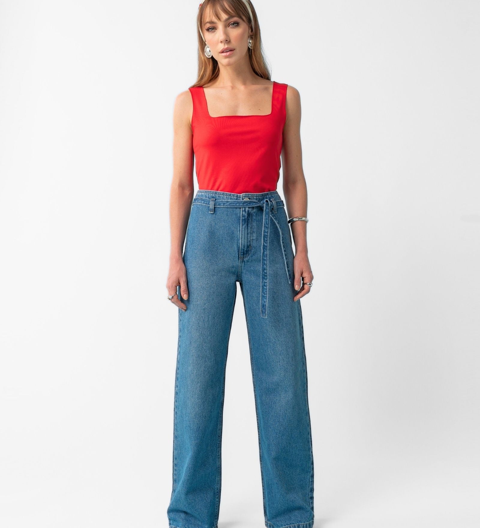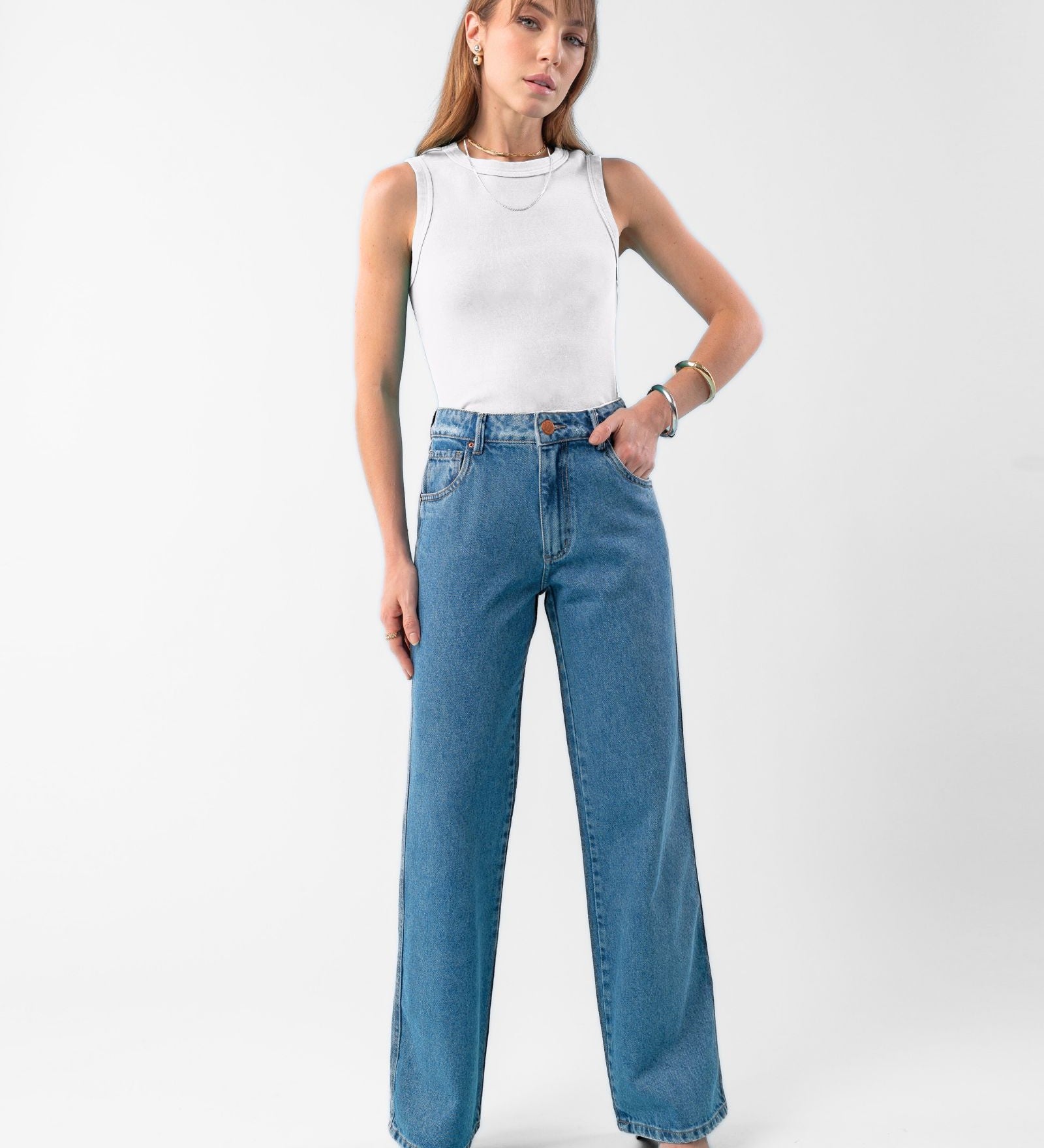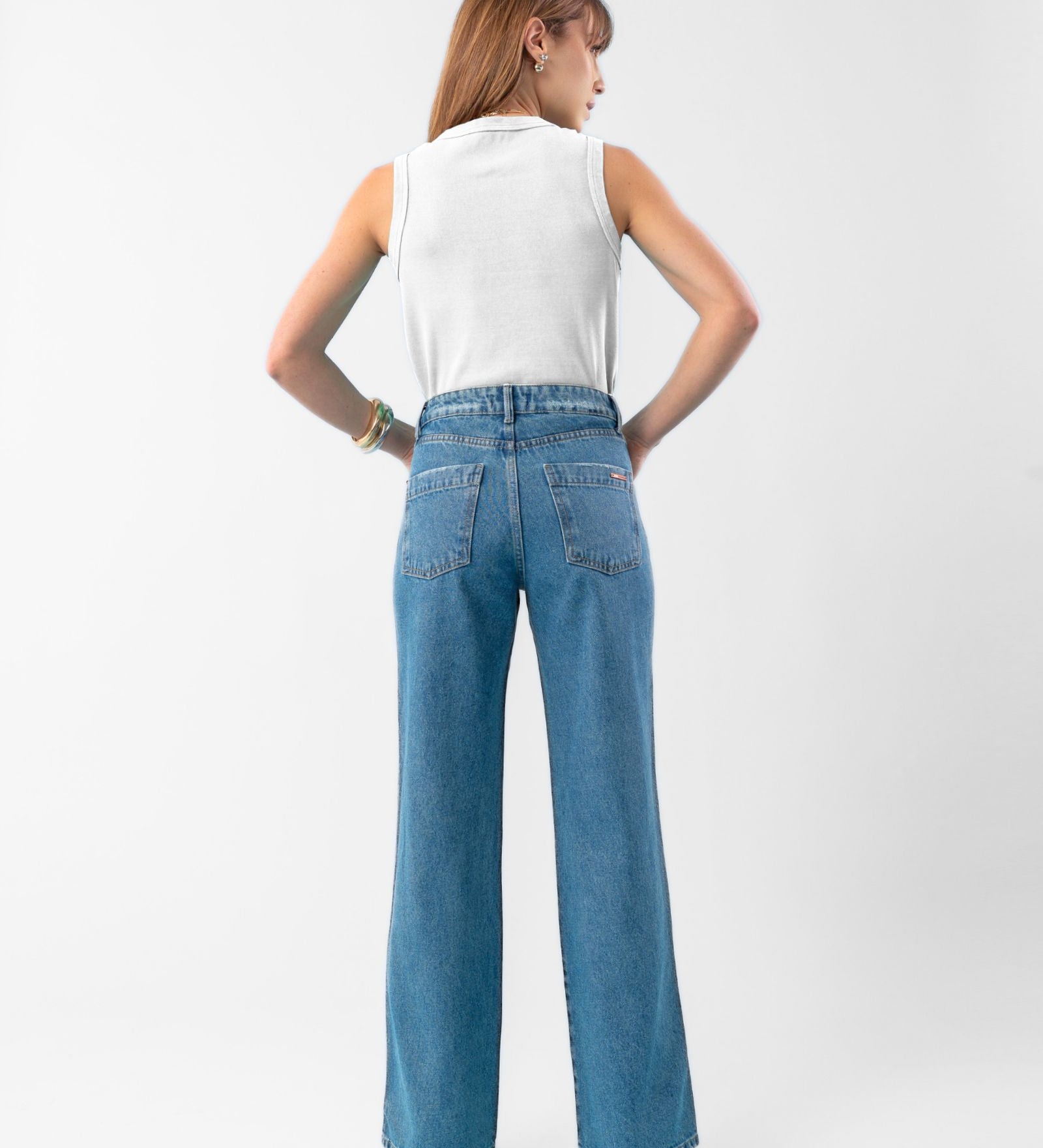 Calça Wide Leg sem Cós com Faixa em Jeans