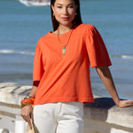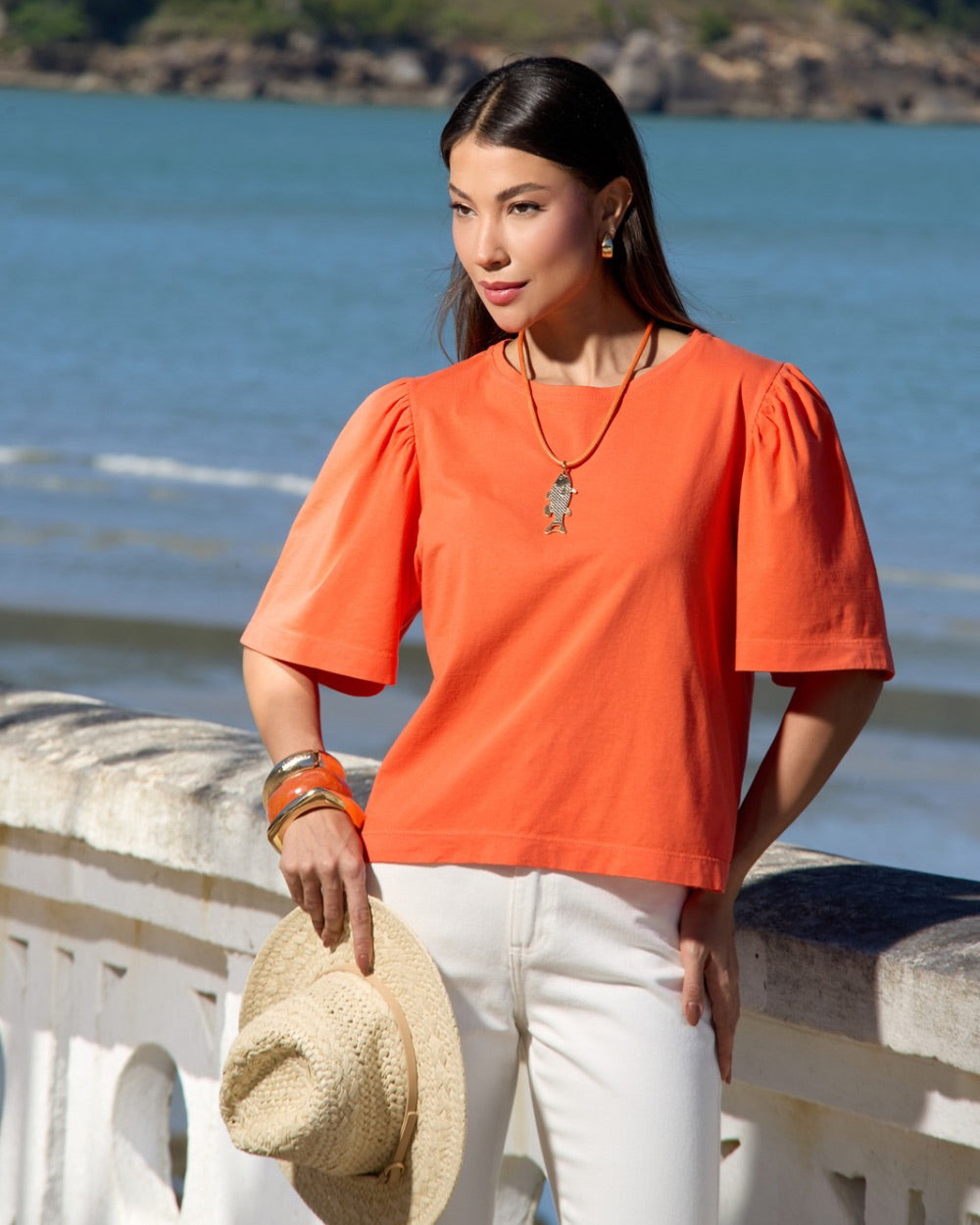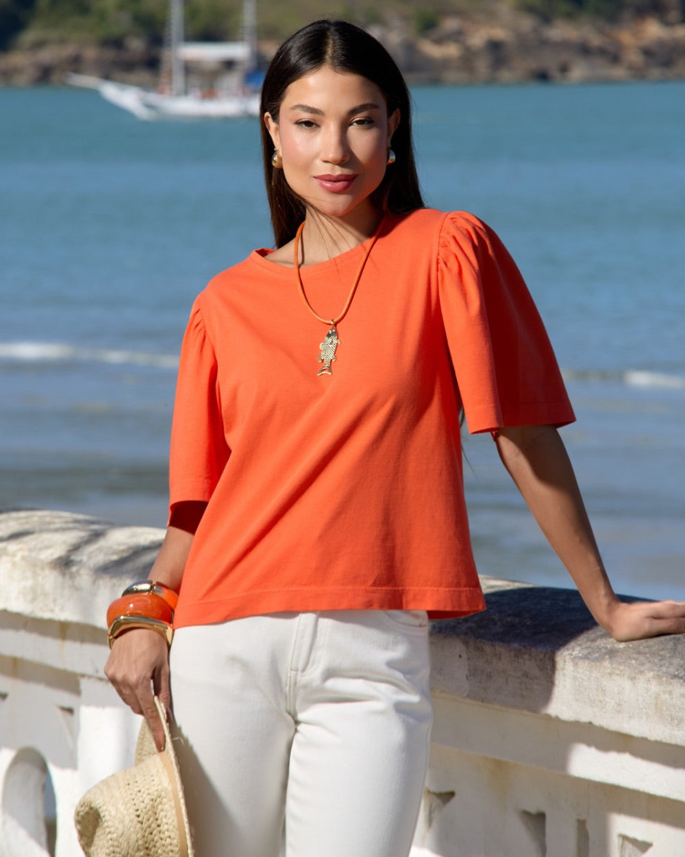 Blusa de manga curta confeccionada em algodão, com detalhe de franzido nas mangas que adiciona um toque delicado e feminino ao visual. Ideal para compor looks casuais com conforto e estilo.