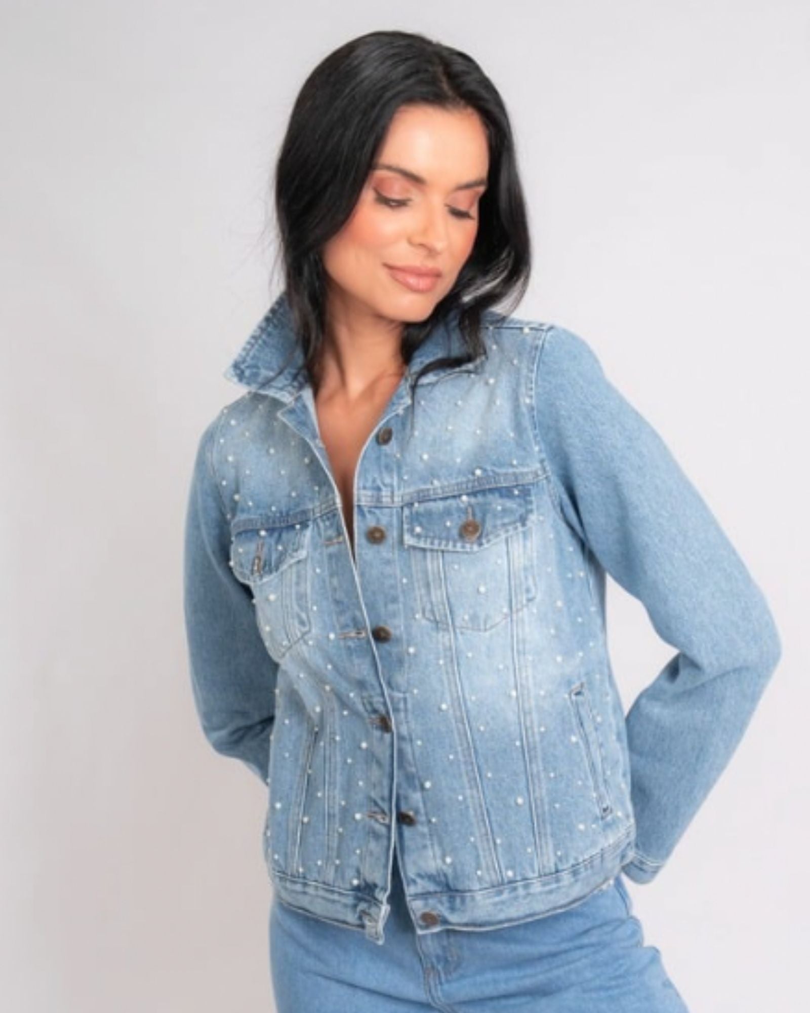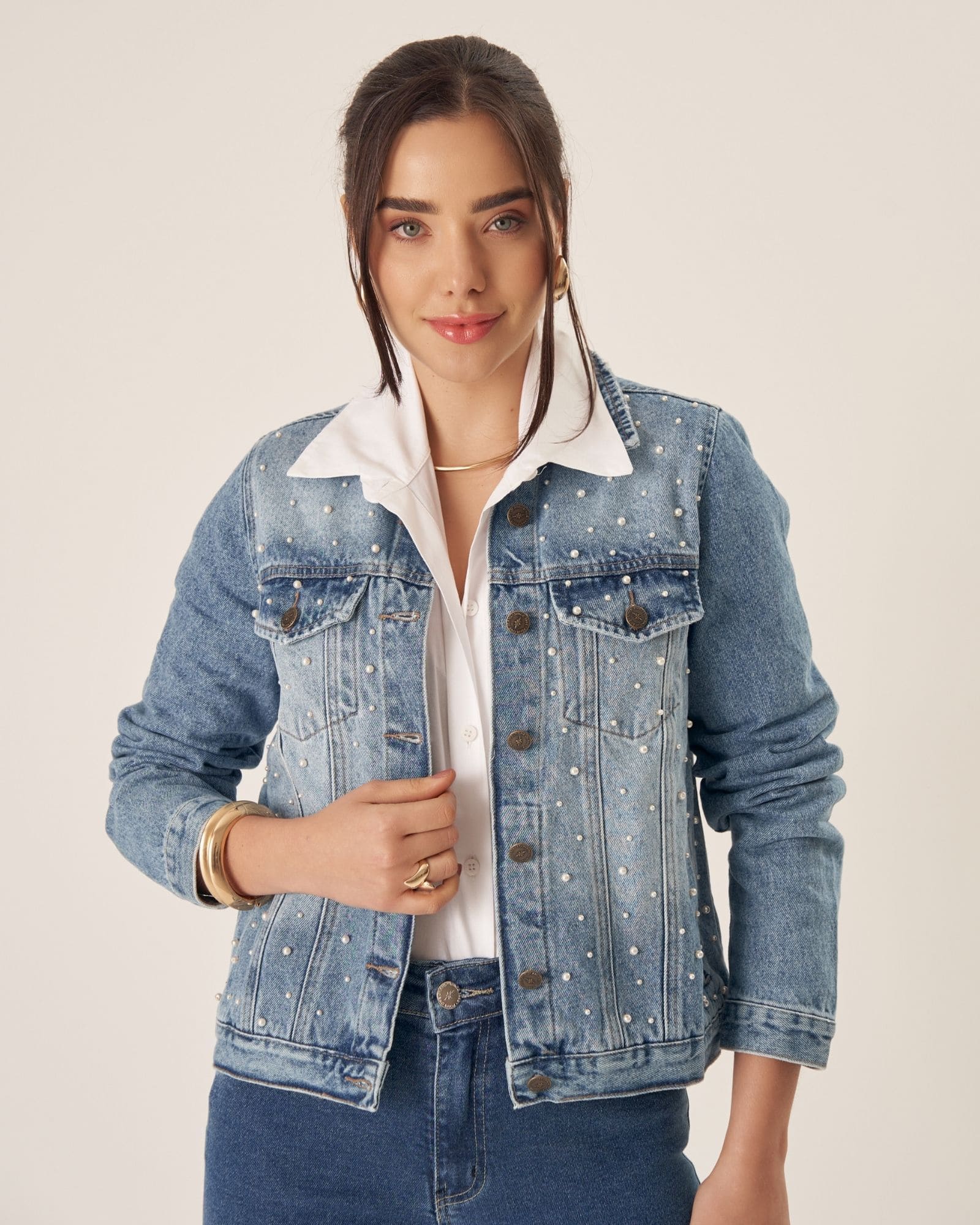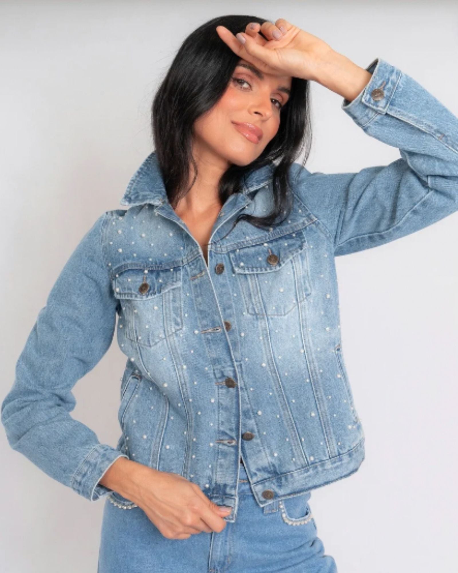 Jaqueta Jeans Tradicional com Pérolas Aplicadas