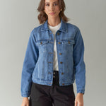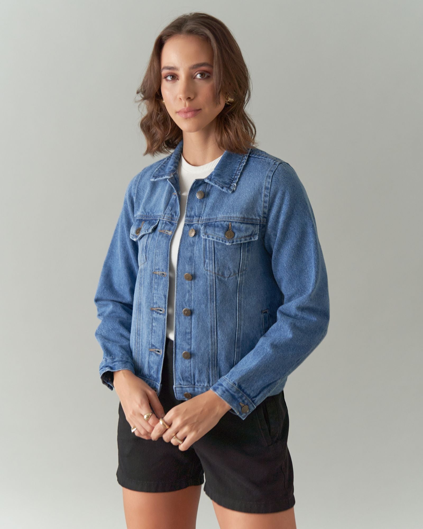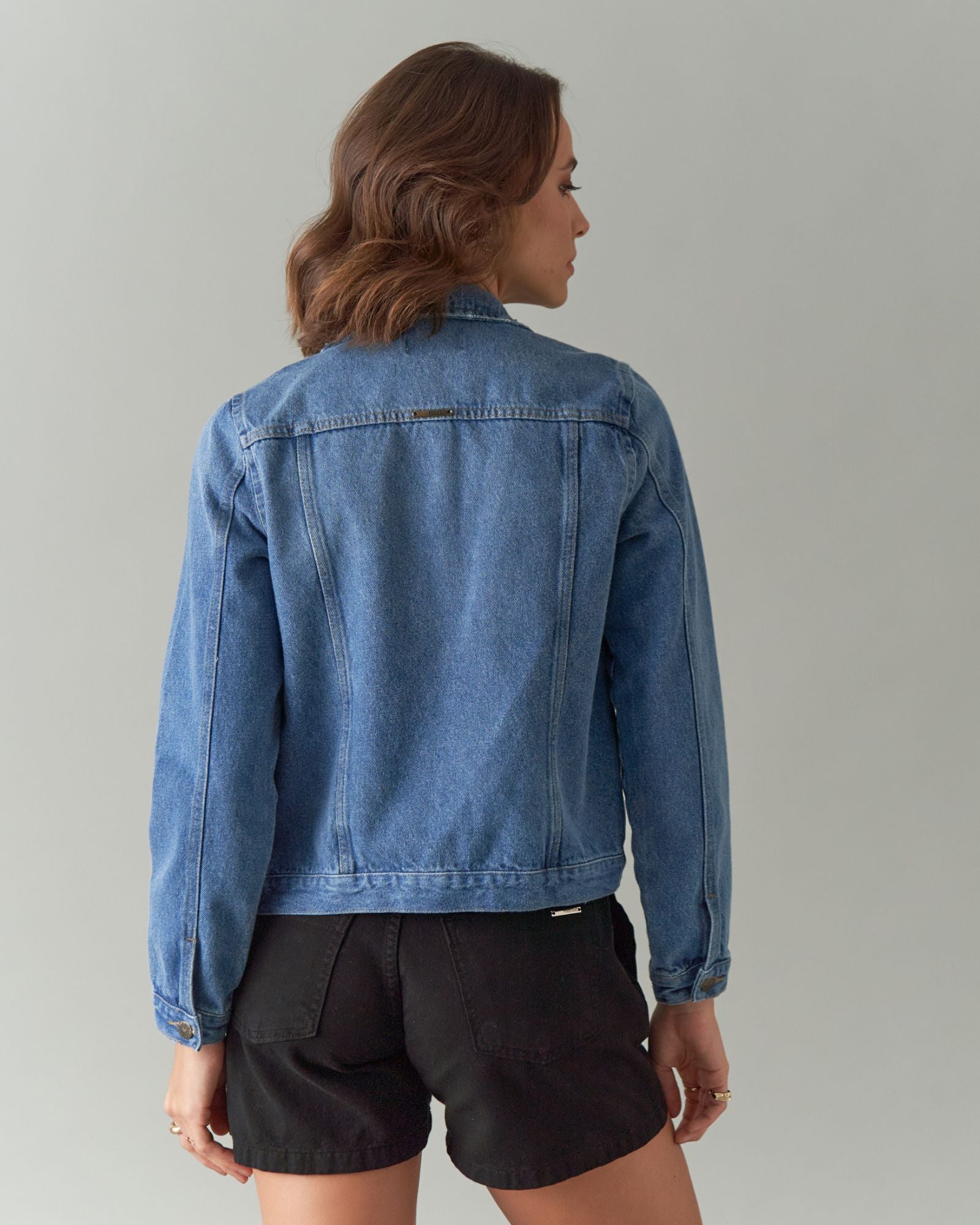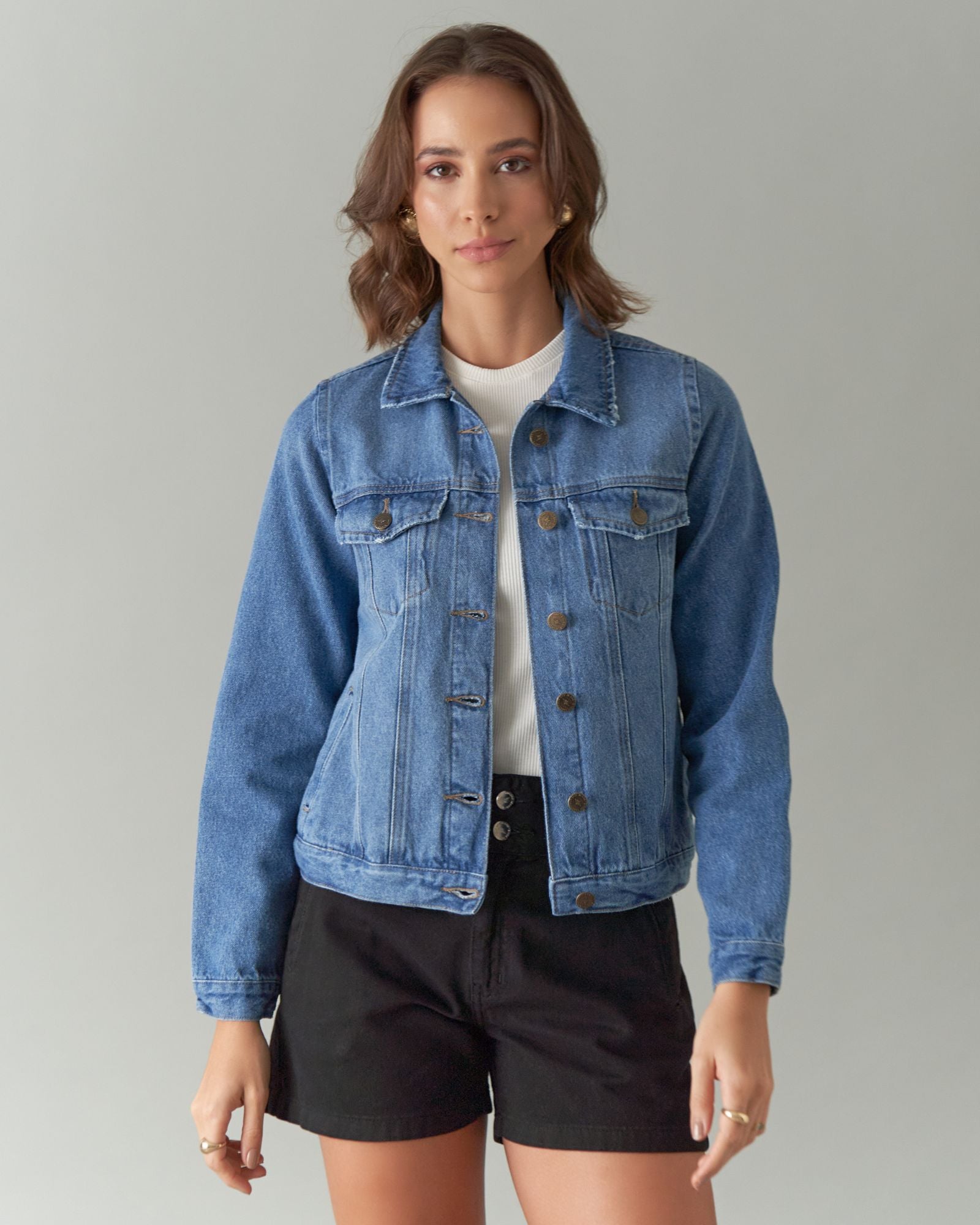 Esta jaqueta jeans de modelagem tradicional é super prática e versátil, perfeita para o dia a dia. Com recortes frontais e traseiros, cós e bolsos frontais com lapela, ela combina estilo e funcionalidade. Os puídos na gola e na lapela dos bolsos, juntamente com a plaquinha de metal na pala traseira, conferem um toque moderno e descolado.